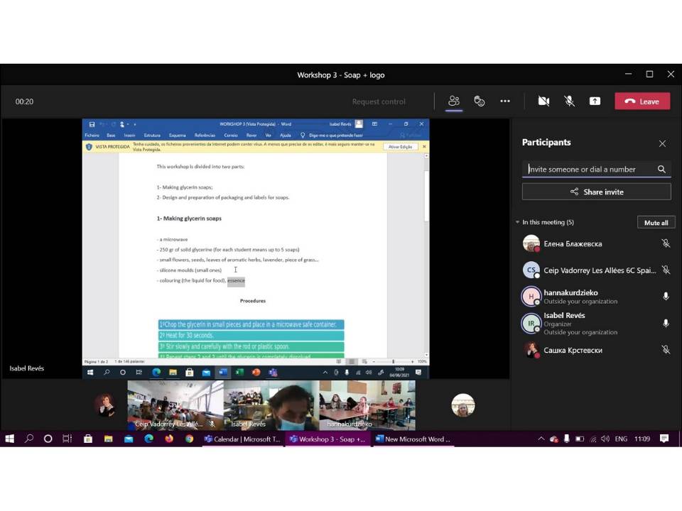 Завршна средба од Еразмус+ проектот „Млади претприемачи“. Гледавме видео, игравме игра Escape room, виртуелна посета на училиштето во Португалија, работилница за изработка на сапуни... завршен состанок со обраќање на директорите, координаторите, наставници и ученици, презентирање на резултатите од проектот, впечатоци... |